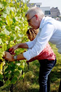 Die Gäste waren jedoch nicht nur zum Plaudern anwesend, sondern wurden allesamt mit Rebschere und Traubenbütte bewaffnet und begaben sich in eine Parzelle mit Auxerrois-Trauben, welche zur Produktion des „Crémant de l’Etat“ geerntet werden. Mit zum Teil geübten Handgriffen waren binnen 15 Minuten gleich fünf Traubenbütten prall gefüllt, mit goldgelben, zuckersüßen Trauben. Wie wir uns vor Ort überzeugen konnten, sind auch die sogenannten Piwis, also pilzwiderstandsfähige Rebsorten, wie Sauvignac oder Calardis, die hier vor Ort gepflanzt wurden, in einem außerordentlich guten Reifezustand.