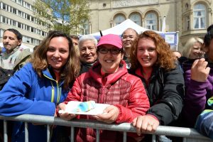 Manche trotzten dennoch dem unwirtlichen Wetter und ließen es sich nicht nehmen, unter den aufgespannten Sonnenschirmen mit dem Regenschirm in der einen, einem Glas Sekt oder Weißwein in der anderen Hand, auf die EU anzustoßen. Offizielle Reden waren ohnehin keine vorgesehen, weshalb die Gelegenheit umso mehr genutzt wurde, mit anwesenden Regierungsmitgliedern und Kandidaten, die am 26. Mai zu den Europawahlen antreten, ins Gespräch zu kommen.