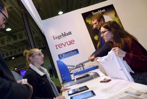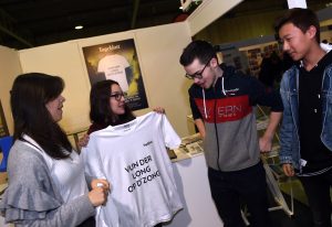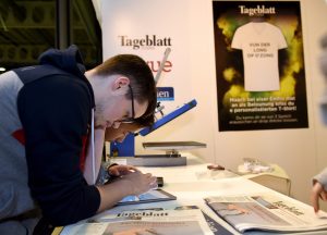 Die Hallen 2 und 3 der LuxExpo, in denen die „Foire de l’étudiant“ ausgerichtet wird, war am Donnerstag gut gefüllt. Auch der Tageblatt-Stand war regelmäßig besucht. Die Schüler können auch am Freitag noch an einer Umfrage zu ihrem Medienkonsum teilnehmen und erhalten zur Belohnung ein T-Shirt mit einem von drei Sprüchen, die sich alle auf die Meinungsfreiheit und den Pressekodex beziehen: „Vun der Long ob d’Zong“, „Héieresoen ass hallef gelunn“ oder „Net vun der Heck gepléckt“. Ersterer erfreute sich am Donnerstag der größten Beliebtheit. Einige blieben auch stehen, um sich über den Beruf des Journalisten zu informieren. Wie sieht der Alltag eines Reporters aus, was muss dieser studiert haben und wie funktioniert eine Redaktion? Das alles waren Fragen, die den Schülern vor Ort beantwortet wurden.