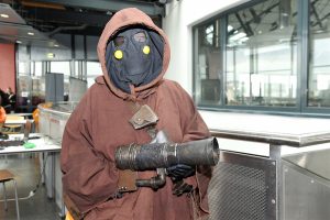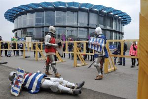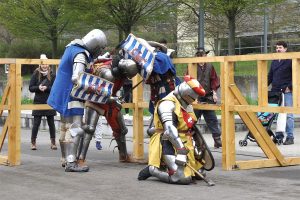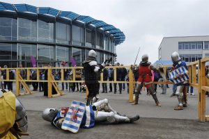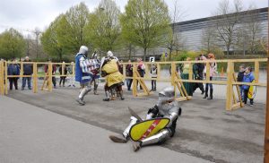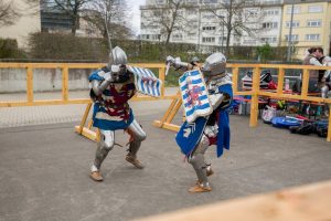 Ebenso sehenswürdig, wenn auch etwas barbarisch, war die Ritterschlacht im Außenbereich. Mit beinahe echten Rüstungen und Waffen aus Metall lieferten sich die Teilnehmer Duelle wie vor tausend Jahren. Mit Schwert und Axt konnten sich die Kontrahenten im Zweikampf so lange auf den Deckel hauen, bis einer von ihnen die weiße Fahne hisste. Dank dicker Polsterung bestand keine Verletzungsgefahr. Nach dem Gefecht konnten die tapferen Rittersleut‘ und auch die hungrigen Besucher mit einem Happen Essen an einem der Foodtrucks wieder zu Kräften kommen.