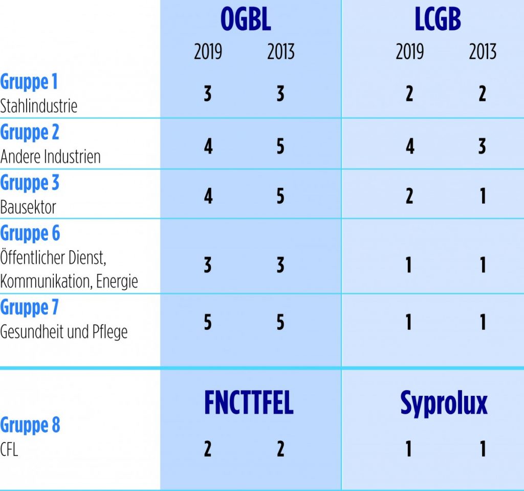 Auch wenn die Ergebnisse der wichtigen Gruppen 4 und 5 noch nicht vorliegen, scheint die absolute Mehrheit des OGBL in der Kammer nicht gefährdet zu sein. In der Industrie (ohne den Stahlsektor) konnte der LCGB einen Sitz hinzugewinnen und kommt nun auf vier Sitze (OGBL ebenfalls vier). Im Bauwesen bleibt der „Onofhängege Gewerkschaftsbond Lëtzebuerg“ die stärkste Kraft, verliert aber einen Sitz, der von der christlichen Konkurrenz gewonnen wurde. Hiermit hat der OGBL vier Sitze und der LCGB zwei.