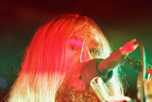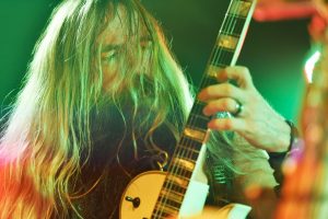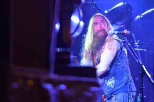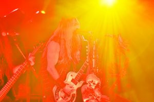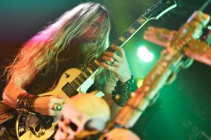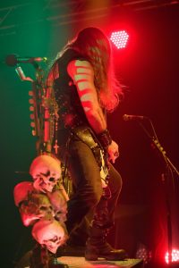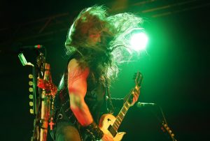 Es folgen darauf hin eher melancholische Melodien, die auf der Bullseye-Gibson-Flying-V-Gitarre einfühlsam interpretiert werden. Jetzt sitzt der Hexer an seinem Synthie-Piano und lässt „Spoke in the Wheel“ berührend erklingen. Beim Song „In this River“ zeigt der Rocker weiterhin, dass er sehr wohl die Tasten beherrscht und auch tolle Arrangements mit viel Feeling begleiten kann. Mit surrendem Stimmenverzerrer erklingt nun „Fire it up“, ehe einige Luftballons durchs Publikum fliegen. Anhand von progressiven Passagen und einem blutigem Solo entwickelt sich das Ganze zu einem bluesig rauchenden Ohrenschmaus. Und da geht der Meister durchs Publikum! Mit Biss- und Aushaltevermögen liefert Wylde eine entfesselte Zirkusnummer ab. Wie im Rausch führt ihn diese Gitarrenwanderung mehrmals im Lokal, inklusive Balkon, hin und her. In einer Holzfällerhaltung gestaltet der Gute auf Teufel komm raus ein improvisiertes Solo, in dem er typische Hendrix-Gimmicks benutzt. Neben einigen feurigen Passagen verbleibt das Solo jedoch teilweise uninspiriert und repetitiv.
