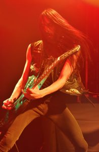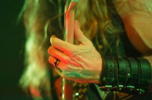 Nun folgt mit „All That Once Shined“ eine eher melancholische Nummer. Mit einem langsamen, schwerfälligen Drive wird hier ein musikalischer Schwelbrand unterhalten. Die blitzschnellen Finger huschen beim Solo zerrend die Tonleiter rauf und runter. Die Songs sind durchwegs melodisch aufgebaut, ohne jedoch in ihren Live-Versionen allzu progressiv daherzukommen. Mit mehreren „Mother Fucking“ Passagen wird die erste Ansprache vorgenommen. So stellt das Alphatier seine Musiker John de Servio (Bass, Background Vocals), Dario Lorina (Rhythmus-Gitarre, Background Vocals) sowie Jeff Fabb (Drums) wie echte Familienmitglieder vor. Doch mit dem Titel „Room of Nightmares“ rollt schon die nächste Druckwelle an.