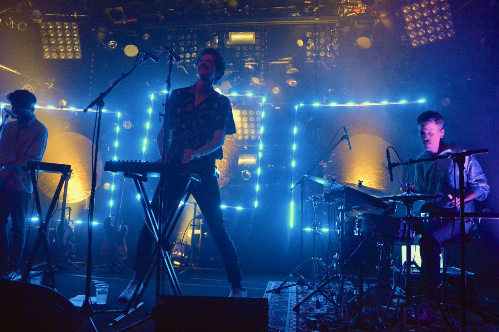 Sänger Aaron Ahrends hantiert mit verschiedenen Gesangsmikros herum und spielt gleichzeitig Synthesizer. Bassist Paul Rundel bedient, sobald er die Hände von seinem (wunderschönen) Höfner-Bass nimmt, weitere Synthis und steuert Backing Vocals bei, während Schlagzeuger Pascal Karier um sein Drumkit herum noch elektronische Pads versteckt hält, die er zwischendurch bearbeitet.
