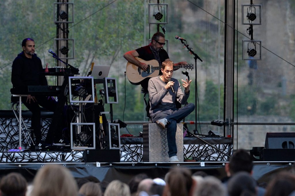 C’est le premier jour de l’été et la veille de la Fête nationale que le slameur a choisi pour se produire sur le parvis de l’Abbaye de Neumünster. Accompagné de ses musiciens, l’artiste a livré un spectacle à son image: authentique et profondément humain.