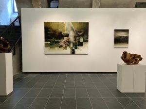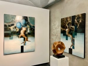 Die gesamte Ausstellung in der Galerie Fellner steht unter dem Titel „Roots“, also Wurzeln, vielleicht da beide Künstler auf ihre holländischen Ursprünge zurückblicken wollen oder aber in der Darstellung von solchen Wurzel-Elementen, die in unterschiedlichen Dimensionen und grafischen Konstellationen vor allem in den Bildern von Joachim thematisiert werden, einfach eine Verbindung zwischen menschlicher Kreativität und Schönheit der Natur herstellen sollen. Die sechzehn nun gezeigten Bilder diverser Formate bewegen sich denn auch alle im Wechselspiel von Natur (Baumwurzeln, Wasser, Wolken) und architektonischen Einsätzen wie in blau-grauen und bräunlichen Tongebungen. Der Künstler setzt bewusst keine grellen Farbtöne ein, um seine „Root“-Bilder und Kompositionen ins für ihn passende und so typische Licht zu tauchen.