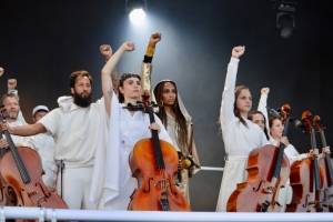 Für die jungen Festivalgänger gab es die spektakulär aufgezogenen Shows zweier Stars der TikTok-Generation, Rosalía und Aya Nakamura. Wahrlich nicht jedermanns Sache, zumal solche Selbstinszenierungen nicht mehr sonderlich viel mit Musik zu tun haben, doch was soll’s, es gab ja genügend Alternativen. Intensiv war der Auftritt der Sängerin Imany, die von acht Celli begleitet ihr Projekt „Voodoo Cello“ präsentierte: ein Programm, das fast nur aus Coverversionen bestand – u.a. von Bob Marley, Radiohead, Imagine Dragons, Tones and I oder Elton John –, die sie sich beeindruckend zu eigen machte und die ihr scheinbar geholfen haben, einen schweren Burnout zu bekämpfen. Am Ende reckte sie die Faust gemeinsam mit ihren Fans in die Höhe („Lever le poing pour changer ce monde, et pour le changer il faut commencer par changer soi-même“).