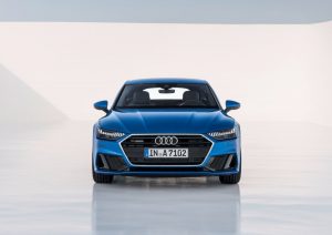 Mit großen Flächen, scharfen Kanten und athletisch gespannten Linien soll der A7 aus jeder Perspektive Dynamik und Progressivität signalisieren. Seine Front ziert ein im Vergleich zum Audi A8 breiterer, tiefer platzierter Grill; schmale Scheinwerfer, die markanten Lufteinlässe sowie der flache Vorderwagen sollen seine Sportlichkeit betonen.