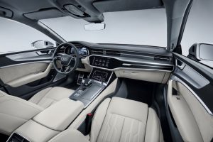 Der Innenraum vermittelt eine futuristische Atmosphäre. Die horizontale Linienführung und die schlanke Instrumententafel sorgen für ein luftiges Raumgefühl. Die Mittelkonsole ist zum Fahrer hin orientiert, ein Lichtpaket zeichnet die Konturen nach. Der A7 folgt nun in seiner Digitalisierungsstrategie dem A8. Sie ersetzt den Dreh-Drück-Steller sowie die konventionellen Tasten und Regler durch zwei große, hochauflösende Touch-Displays.