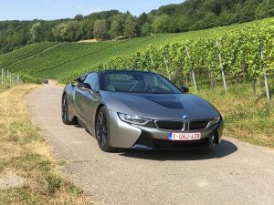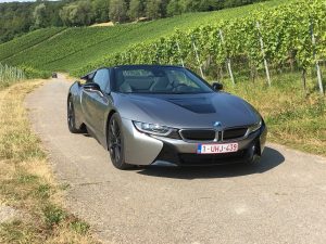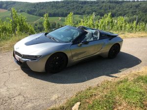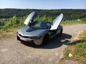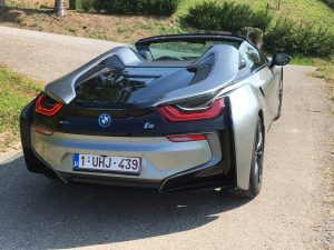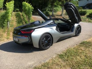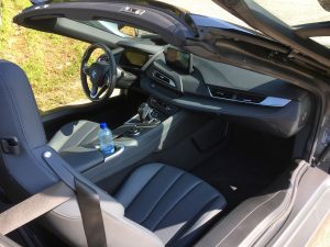 Da ist also der i8 Roadster, ein Zweisitzer mit Stoffverdeck, das hinter den Kopfstützen in der Karosserie verschwindet, Fahrer und Beifahrer finden hinter den Sitzen Stauraum für leichtes Gepäck, Ablagen in den Türen gibt es keine, aus gutem Grund, wer so schräg nach oben öffnet, möchte die Umwelt nicht mit herumfliegenden Sachen wie Handy oder Feldstecher belasten. Der kleine Dreizylinder liegt hinten, da bleibt noch etwas Platz für Aktenkoffer oder Schminktasche, vorne liegt der E-Motor, der 143 PS leistet und seine Kraft aus einer Batterie schöpft, die eine Leistung von 11,6 kWh hat, was im Fahrbetrieb so um die 50 km Autonomie ermöglicht.