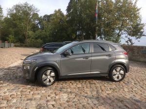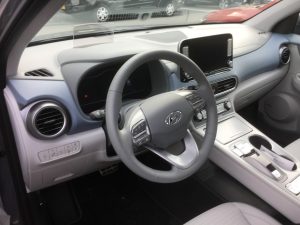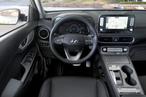 Das Modell mit der 64 kWh starken Batterie, die unseren E-Kona auf einer ersten kurzen Probefahrt ausstattete, hat Autonomie von 482 km (WLTP) und verbraucht 15,2 kWh auf 100 km. Der Elektromotor leistet hier 150 kW/204 PS und hat das gleichemaximale Drehmoment von 395 Nm. Das reicht für 167 km/h Spitze. Zum Laden braucht man gut über neun Stunden an der Steckdose und knapp eine Stunde für 80% Batteriekapazität an der Schnellladestation mit 100 kW. Drei vorwählbare Fahrprogramme lassen sich per Knopfdruck einstellen, mit „Sport“ ist man herrlich erfrischend und agil unterwegs. Eine wertvolle Bremshilfe sind die beiden Paletten am Lenkrad, mit denen man die Intensität der Rekuperation beim Bremsen oder Loslassen des Pedals in vier Stufen regeln kann, wer hier die Palette voll durchgedrückt hält, kann das Auto zum Stehen bringen, ohne die Fußbremse zu betätigen, sehr zur Freude der Zeitgenossen, die hinter Ihnen heranfahren!