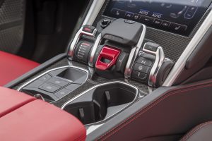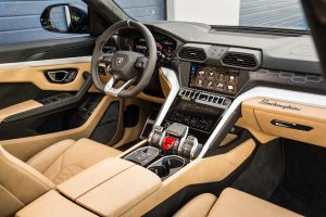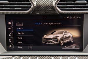 Im Terrain ist der Urus sicher kein Land Rover Defender, dafür auf der Rennstrecke aber auch nicht! Dort geht er nämlich nicht nur wie die Feuerwehr ab, nein, man kann die Feuerwehr sogar innen in der Kurve ausbremsen und überholen, dank Allradantrieb mit Torque Vectoring, einer standardmäßigen 40/60-Gewichtsverteilung zugunsten des Hecks, geradezu gigantischen Bremssätteln für serienmäßige Carbonbremsen der Dimensionen 440 mm (vorne) und 370 mm (hinten), griffigen Pirelli P Zero-Reifen der Dimensionen 21-23 Zoll, einer Hinterachslenkung aus dem Aventador S, die sich über den ganzen Aktionsradius spannt, und last but not least den fünf Fahrmodi, deren „Corsa“-Stufe das ganze Setup noch einmal bestialisch verschärft. Die Modi Strada (Standardeinstellung), Sport, Corsa, Neve (Schnee) und Terra (Dreck, Schotter, Geröll) sowie Sabbia (Sand) lassen sich über die linke Anima-Seite des neuartigen Tamburo steuern, der wie ein doppelter Schubhebel eines Flugzeugs oder Motorbootes sich wie eine geradezu diabolische Thermosflasche quer über den Mitteltunnel spannt und die Fahrdynamik (links) sowie das Fahrwerk (rechts) regelt. Auf dem rechts platzierten Ego-Fahrschalter werden die Härte des Dämpfer und der Lenkung gesteuert. Besonders die Scheiche werden „Sabbia“ lieben.