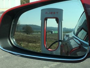 Unser Modell, der Tesla S 100D, hatte eine Batterie mit einer Speicherkapazität von 100 kWh, das ergibt eine Leistung von 315 kW oder 428 PS, die den Wagen von null auf hundert in etwas mehr als vier Sekunden beschleunigen und eine Spitzengeschwindigkeit von 250 km/h ermöglichen. Als Reichweite bei voller Batterie werden maximal 510 bis 540 km angegeben, wer schnell unterwegs ist, sollte sich auf etwas über 400 km einstellen. Bordcomputer und GPS kümmern sich um den Verbrauch und lotsen einen dann zu einem der Tesla-Supercharger entlang der Hauptverkehrsachsen, die so verteilt sind, dass man den Trip zum Mittelmeer bedenkenlos unternehmen kann, ohne für das Aufladen eine Übernachtung einplanen zu müssen. Die Ladedauer beträgt gut 40 Minuten für ungefähr 80% der Batteriekapazität.