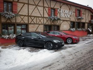 Fünf Tage lang fuhren wir dieses futuristische Ding, darunter eine lange Fahrt nach Vonnas im französischen Département Ain und wieder zurück, mit einem Ladestopp auf der Hinfahrt, einem Ladestopp bei der Ankunft und dann zwei Ladestopps auf der Rückfahrt, einer davon in Nuits-Saint-Goerges, um den Kofferraum mit köstlichem Traubensaft zu beschweren, sollte ja niemand glauben, wir wären einfach nur zum Spaß in den weißen Süden abgeschwirrt!