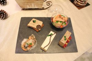 Zu den Häppchen-Kompositionen zwischen „Land und Meer“ gehört außerdem „La fameux cheesecake à l’avocat et saumon fumé“ auf einem Mürbteig und Hering-Kaviar. Die „Bûchette de rillettes de Canard du Gers“ mit karamellisiertem Granny-Smith-Apfel, Himbeeressig, Bauernbrottoast und Crackern lässt einem ebenfalls das Wasser im Mund zusammenlaufen. Den Abschluss dieser ersten Gourmet-Runde bildet das „Petit cadeau de bavarois de légumes confits, surprise de thon mi-cuit et sirop d’agrumes“.
