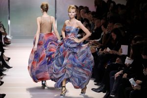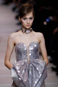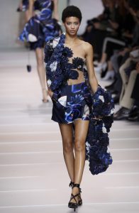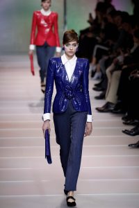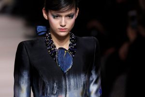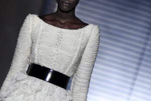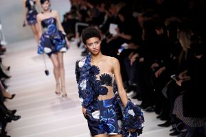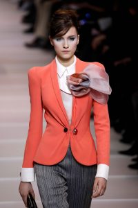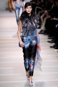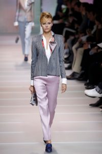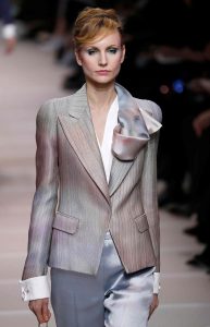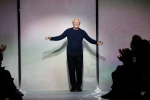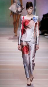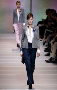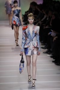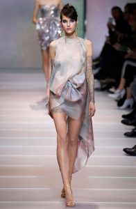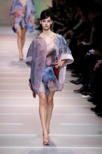 Mode-Maestro Giorgio Armani hatte sich in seiner Schau für ein Wolkenthema entschieden: Heraus kamen Entwürfe in duftiger Seide, oft mehrlagig, mit Drucken in verwischten Himmelsfarben. Diese wirkten wie Aquarelle und erinnerten an Wolkenbilder von Expressionisten. Trotz der Kunstfertigkeit erschien die Kollektion blass. Neben Ballonkleidern mit kurzen Shorts gab es viele Hosenanzüge, die fürs Office taugten, doch etwas altbacken wirkten.