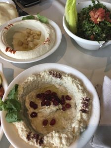 Ob gefüllte Weinblätter mit Reis („Warra(k) Einab“) oder Gemüsepürees wie „Baba Ganoush“ (aus Auberginen, Sesampaste, Knoblauch, Minze und Petersilie) oder das als „Hummus“ bekanntere Kichererbsenpüree, diese Spezialitäten nehmen neben gefüllten Filoteigtaschen („Sambousa“, ähnlich dem türkischen Börek und eine warme Vorspeise) in diesem ersten Gang Platz.