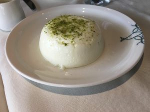 Auch das Dessert, der süße Abschluss des Mahls, protzt nur so von verschwenderischer Vielfalt. „Baklava“, dieser Klassiker der orientalischen Küche, mit Pistazien- bzw. Walnussfüllung im Filoteig mit sehr süßem Sirup überzogen, kommt in Begleitung eines Kuchens aus hauchdünnem Blätterteig und Sesam-Honig-Einlage. Ein echtes Leichtgewicht hingegen ist die „Mehabaiya“, eine Panna-Cotta-artige stichfeste Creme mit Mandelmilch, einem Hauch Rosenwasser und einer Pistazienkrone.