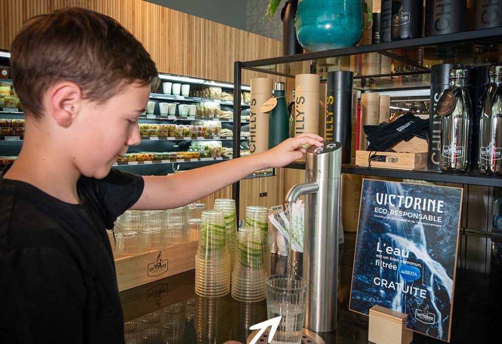 Die hausgemachten Limonaden und das Mineralwasser werden in PLA-Flaschen eingefüllt. Der Kunststoff aus Biomilchsäure („Polylactid“) ist biologisch abbaubar. Im Restaurant versorgt ein spezieller „Wasserhahn“ kostenlos die Gäste mit stillem oder gesprudeltem Wasser. Und wer sein Heißgetränk im eigenen mitgebrachten Becher genießen möchte, wird belohnt und zahlt weniger.