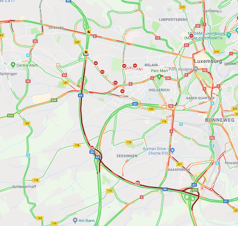 Auf der Hauptverkehrsader hat sich dann auch prompt ein sechs Kilometer langer Stau gebildet. Momentan zieht sich die Blechlawine bis zum Gaspericher Kreuz. Auch die Alternativen über Hollerich und Merl sind derzeit überlastet und es geht nur sehr langsam voran.