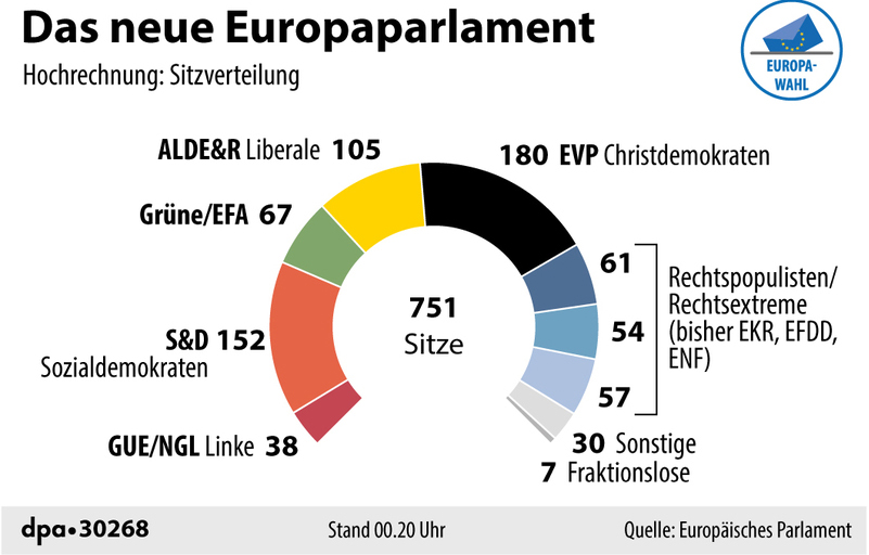 Keinen Zugang zur Macht sollen (wie bisher) die Rechtspopulisten und Nationalisten erhalten. Dabei haben auch sie bei der Wahl am Sonntag zugelegt. Die bisher auf drei Fraktionen verteilten EU-Gegner kommen nun zusammen auf 171 Sitze, das sind 16 mehr als bisher.