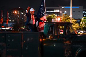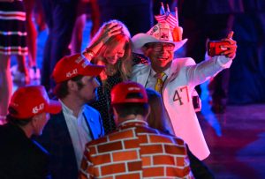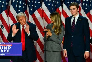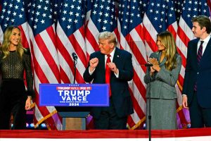 Die ehemalige First Lady der USA Melania Trump, Barron Trump, Viktor Knavs, der republikanische Vizepräsidentschaftskandidat J.D. Vance und seine Frau Usha Vance, Ivanka Trump und ihr Ehemann Jared Kushner lauschen der Rede des ehemaligen US-Präsidenten und republikanischen Präsidentschaftskandidaten Donald Trump bei einer Wahlkampfveranstaltung im West Palm Beach Convention Center am frühen Morgen des 6. November Foto: Jim Watson/AFP