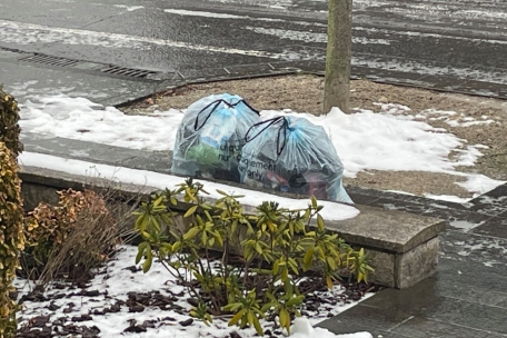 Seit gestern Abend warten diese beiden Säckein Esch darauf, abgeholt zu werden. Daraus wird heute aber leider nichts. Straßen, Bürgersteige und Hauseingänge sind von einer trügerischen Eisschicht bedeckt. Da sollte man mal lieber nichts riskieren. Und das bisschen Kälte und Eis machen Plastik eh nichts aus.