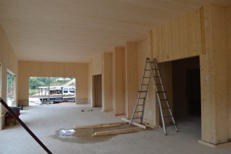 Nachdem die Baufirma Solid das Fundament und die Grundmauern fertiggestellt hatte, begann die Firma Hermes aus Hosingen dieser Tage mit dem Aufbau der speziellen Holzkonstruktion. Sowohl die Wände als auch die Decken bestehen aus über Kreuz geleimten 19 bzw. 21 Zentimeter dicken Holzelementen.