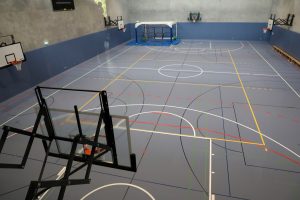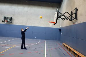 Highlight des Anbaus ist die Multisporthalle im Erdgeschoss, die mit 644 Quadratmetern der größte Turnsaal in Eschs Schulen ist. „Unsere Sporthallen sind alle von montags bis samstags ausgebucht – von Schulen, Vereinen und „Maisons relais“. Deshalb ist es umso schöner, nun einen großen Saal hinzuzubekommen“, sagt Mischo. In der linken Ecke des Raumes steht ein sogenanntes Flex-Motorikzentrum – genauer genommen das erste in Luxemburg. Dabei handelt es sich um ein zusammenfaltbares Gerüst, von dem verschiedenförmige Schaukeln herunterhängen. Darauf können die Kinder neben dem Schaukeln auch balancieren, klettern oder einen Kombinations-Parcours absolvieren und so ihre Motorik trainieren.