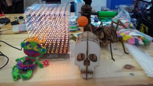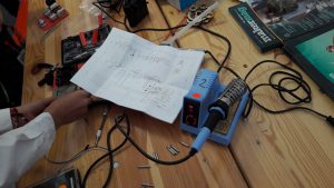 Am Stand von „Bee Creative“ wird hingegen fleißig gebastelt und getüftelt. Ich soll meinen Finger auf ein Messgerät legen, das dann die entsprechende Temperatur anzeigt. Ein kleiner Junge hat dieses Projekt gerade fertiggestellt, erklärt Jeff mir, während zwei weitere Erfinder an einem Roboter arbeiten.