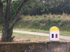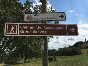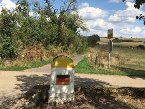 Gestört wird die Idylle nur von nationalen Symbolen, die hier fehl am Platz wirken. Das von Bäumen und Hecken eingerahmte blaue Europaschild an einer Straßenkreuzung ist so ein Beispiel oder die Grenzsteine, die auffällig mitten im Grün stehen. Irgendjemand hat auf der einen Seite die Nationalfarben Frankreichs aufgemalt. Die Rückseite zeigt Schwarz-Rot-Gold, die Nationalfarben Deutschlands. In Leidingen oder Leiding-les-Bains können sich Franzosen und Deutsche zuwinken und ohne Grenzübertritt ein Schwätzchen halten.