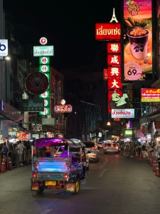 In einer Seitenstraße probieren wir etwas Streetfood, dann fahren wir mit einem Tuctuc in eine andere Gegend. Wir wollen etwas von dem berühmt-berüchtigten Nachtleben Bangkoks mitbekommen. Es gibt verschiedene Viertel, die sich nachts in ganze Ausgehmeilen verwandeln. Einige davon sind Rotlichtmilieus, denn leider ist Thailand eines der beliebtesten Ziele für Sextouristen aus dem Westen. Diese Viertel gelten für einige Backpacker als guter Grund, die Stadt nicht zu mögen. Zudem empfinden viele sie als zu unübersichtlich, zu laut, zu schmutzig.