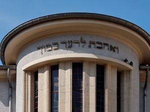 Entdeckt man die neue Synagoge über die Kanalstraße von „Al Esch“ herkommend, überrascht seine Architektur. So scheint die schlanke Konstruktion gen Himmel zu streben. Eine halbkreisförmige, von fünf schmalen Fenstern durchbrochene Apsis wird beidseitig durch einen zweifachen Vorsprung erweitert. Diese eckigen Ausbuchtungen der Seitenfassaden weisen auf die Einteilung des Innenraumes hin. In der Apsis ist der liturgische Bereich untergebracht. Dieser geht in den breiteren, rechteckigen Gebetsraum über. Über die Fassade der Apsis läuft in hebräischen Lettern der biblische Vers „Du sollst deinen Nächsten lieben wie dich selbst, Leviticus 19:18“.