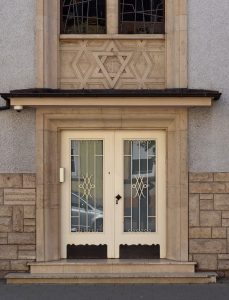 Die Synagoge wird durch einen Garten gerahmt, dessen niedriges Gitter in regelmäßigen Abständen von einem abstrakten Motiv durchbrochen wird, das sich an dem Davidstern, einem Symbol des Judentums, inspiriert. Das gleiche Muster ziert die doppelte schmiedeeiserne Eingangstür der Synagoge. Letztere ist in der Kanalstraße an die benachbarte Häuserfront angebaut, in der Dicksstraße aber freistehend. Die Eingangstür ziert ein Rahmen aus Werksteinen, ein Dekor, das auf der Fassade weiter nach oben verläuft, um einen mit dem Davidstern verzierten Türsturz zu integrieren. Über dem leicht vorspringenden Eingangsbereich wird nach jüdischer (5713 nach der Erschaffung der Welt) und nach gregorianischer Zeitrechnung (1953) an die Grundsteinlegung erinnert.
