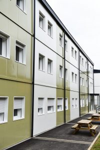 Die Wohnstruktur im Escher Neudorf bietet mit 75 Zimmern Platz für 150 Personen, aufgeteilt auf zwei Gebäude mit je drei Stockwerken in Modulbauweise. In jedem der spartanisch eingerichteten Zimmer befinden sich zwei Betten, zwei Metallschränke, ein Tisch sowie mehrere Stühle. Einige Zimmer sind miteinander verbunden, sodass auch Familien zusammen wohnen können. Bad und Küche sind auf dem Gang. Auf jedem Stockwerk gibt es größere Küchen und sanitäre Einrichtungen. Die Waschmaschinen befinden sich indessen im Erdgeschoss.