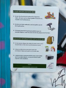 Wenn man den Parkplatz vor dem Kulturzentrum „Op der Fabrik“ erreicht, fällt einem nicht weit von der orientalisch bemalten Bücherzelle ein bunt verzierter Container auf. Es handelt sich um eine Givebox. Dort können Bewohner und Passanten Gegenstände, die sie selber nicht mehr benötigen, ablegen beziehungsweise etwas mitnehmen, das in ihren Haushalt passen würde. So wechseln Bücher, Spielwaren, Kleidungsstücke, Gläser oder Küchensets den Besitzer und statt in den Müll zu landen, wird die Lebensdauer der Alltagsgegenstände verlängert. Dadurch wird ein Beitrag zur Müllvermeidung und Ressourcenschonung geleistet.