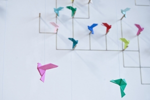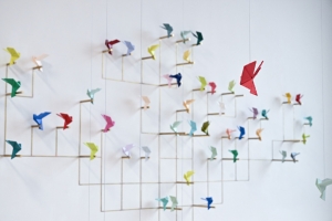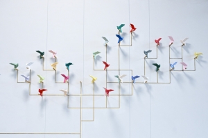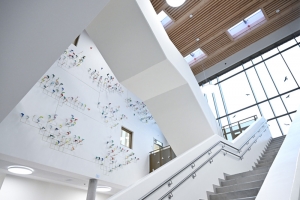 Im Innenbereich bestand die Herausforderung darin, die hohe Wand im geräumigen Treppenhaus/Foyer zu meistern. Die Lösung fand das Künstlerpaar Alice und David Bertizzolo mit ihrer Plastik „Arborescence(s)“. Die Baumstruktur und ihre Verästelungen symbolisieren die schulische Laufbahn eines Kindes, die bunten Origami-Vögel, zusammen mit den Kindern geschaffen, die Vielfalt der Schülerschaft.