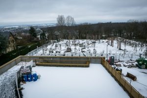 Aufgrund der bekannten Situation hatten sich die Bauarbeiten etwas verzögert, sodass am Montag noch einige Details gefehlt haben. So manches Regal steht noch leer und bei den „Piazzas“ auf jedem Stockwerk fehlen die Sitzmöbel. Einige Garderoben wurden ebenfalls noch nicht geliefert, wie auch der spätere Naturschulhof noch nicht fertiggestellt ist.