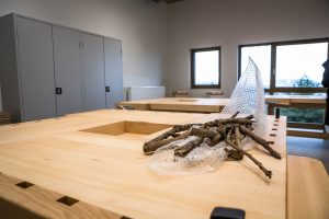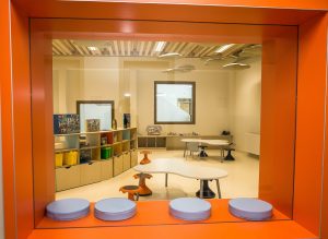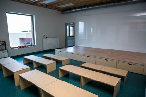 Die modernen Standards gelten auch beim Mobiliar: Stühle und Tische sind höhenverstellbar. Ein paar der Schulbänke können während des Unterrichts zu Tafeln umfunktioniert werden: Die Kinder können ihre Notizen wie bei einem Whiteboard darauf schreiben, es umdrehen und so der restlichen Klasse zeigen. Magnetische Wände gehören ebenfalls zur Ausstattung. Wolken an der Decke dienen der Verbesserung der Akustik.