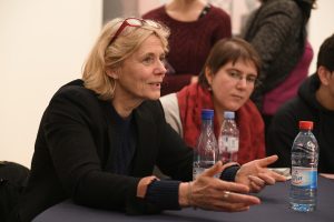 Beim Rundtischgespräch „Die Gesellschaft im Angesicht der Gegenwart“ war mit Florence Aubenas ein Tapetenwechsel angesagt. Mit großer Begeisterung und viel Charisma ging die Monde-Reporterin immer locker und fachkundig auf die Befragungen der Zuhörer ein. Sie erläuterte eingangs anhand der Gilets-jaunes-Bewegung, weshalb sich die französische Presse heute so schwertut, um die Komplexität der Aktualität zu meistern. In der Tat stellten die Journalisten die Protestierenden anfangs als schmutzige Mitläufer von Marine Le Pen dar. Erst später korrigierten sie diese krasse Fehleinschätzung nur zögernd. Zudem haben sich die Zeiten für die Journalisten gewaltig verändert. Solange man in den 90ern in Ruanda als Reporter ein Pressezeichen trug, senkten sich die Gewehre vor einem. Doch bereits im Irakkrieg wurde man dank desselben Zeichens zur Zielscheibe, die es zu treffen galt. Im gleichen Atemzug betonte Aubenas, dass die Gewalt, der die Journalisten nun überall ausgesetzt sind, zum Teil durch hausgemachtes Fehlverhalten selbst verschuldet sei.