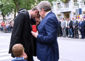 Im Anschluss an die Reden wurden wie gewohnt verdienstvolle Militärangehörige ausgezeichnet. Und dabei gab es eine ergreifende Szene, als der Mann von Tanja Schaul zusammen mit seinem Sohn die Verdienstmedaille seiner Gattin erhält. Die Polizistin im Grad eines „Commissaire adjoint“ wurde bei dem Einsatz-Unfall in Lausdorn im April 2018 schwer verletzt.