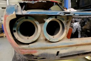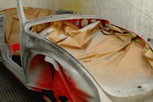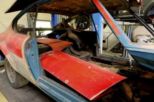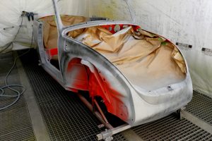 Betritt man das Atelier der Werkstatt, springt einem eine Reihe von kraftvollen, klassischen Oldtimern ins Auge. Zwei Mechatroniker schrauben an der Unterseite eines alten Automodells, das komplett ohne Lack fast wie nackt aussieht. Ein Karosseriearbeiter bringt ein anderes Fahrzeug in die „Lackierkabine“, um diesem wieder mehr Farbe zu verleihen.