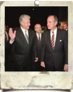 Boris Jelzin war der erste Präsident Russlands und das erste demokratisch gewählte Staatsoberhaupt des Landes. Am Rande des Weltwirtschaftsgipfels in München unterhielt sich der russische Präsident mit seinem US-amerikanischen Amtskollegen George Bush. Themen des Gipfels waren unter anderem die irakische Invasion im Kuwait und die Situation in Nahost. (Foto: AP/Juha Karkkainen/Lehtikuva)