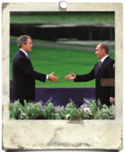 Am Ende ihres Treffens am 16. Juni 2001 in Ljubljana, Slowenien, meinte George W. Bush, dass sein Gegenüber Wladimir Putin ein „geradliniger und vertrauenswürdiger“ Mann sei. Bushs damalige Sicherheitsberaterin Condoleezza Rice urteilte später, dass diese Einschätzung ein „ernsthafter Fehler“ gewesen sei. Bei dem Treffen ging es unter anderem um Waffenkontrolle sowie um die Souveränität und territoriale Integrität der Ukraine und Georgiens. (Foto: AP/J. Scott Applewhite)