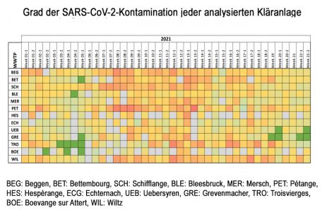 Der lässt sich auch wieder besonders gut in der Überblickgrafik erkennen, die die Werte jeder Kläranlage für jede Ausgabe eines Reports über ein Farbfeld wiedergibt. Bei den aktuellen Werten, die ganz rechts liegen, taucht wieder vermehrt ein leichtes oder sogar sattes Grün auf. Aktuell ist das bei Grevenmacher und Übersyren der Fall – dort sind die Spuren im Wasser nämlich inzwischen nahe der Nachweisgrenze – was also nicht gleichbedeutend damit wäre, dass die Abwässer dort völlig frei von Sars-CoV-2 wären.