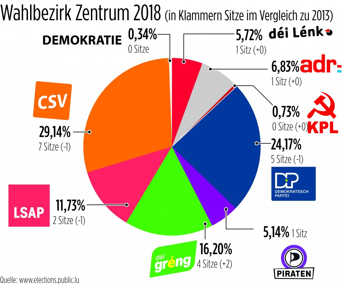 Die Grünen konnten, wie im landesweiten Trend, auch im Bezirk Zentrum die größten Stimmenzugewinne verbuchen, während die CSV die größten Verluste dort hinnehmen musste.