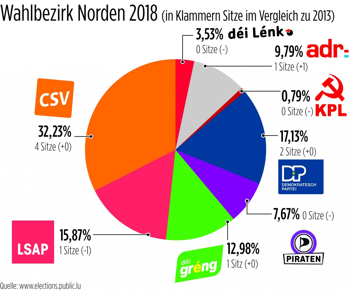 Reichlich Spannung wurde im Vorfeld für den Bezirk Norden prognostiziert. Und es kam auch so: Die CSV bleibt mit vier Sitzen stärkste Partei. Die DP (2) bleibt ebenfalls beim Ergebnis von vor fünf Jahren. „déi gréng“ halten ihren Sitz, während die LSAP ihren zweiten Sitz verliert – zugunsten der ADR, die im Norden kräftig zulegt. Trotz eines Zugewinns von mehr als vier Prozentpunkten reicht es derweil nicht für die Piraten.