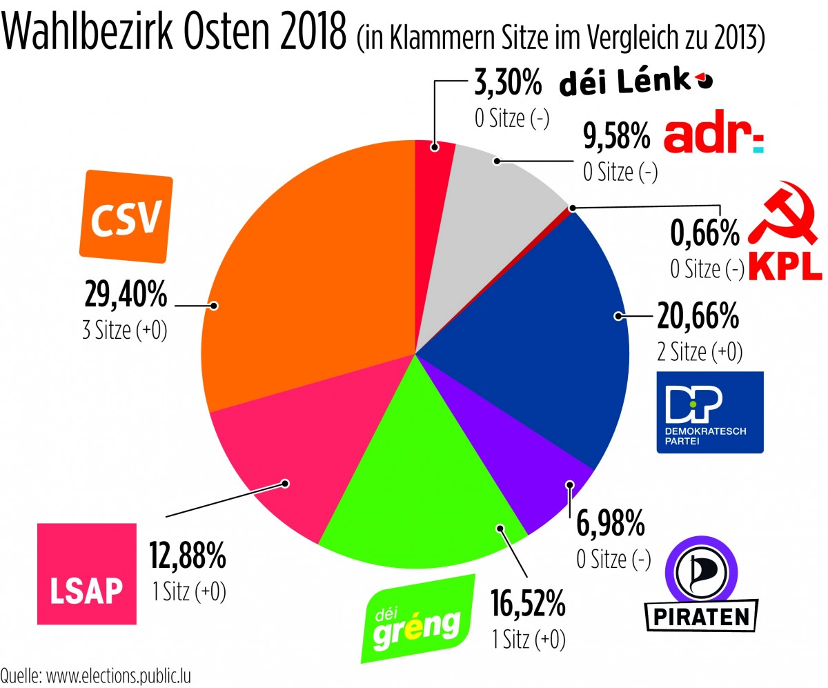 Ebenfalls nicht für einen Sitz reichte es bei „déi Lénk“, die auf 3,53 Prozentpunkte kommen – das ist ein Plus von fast einem Prozent im Vergleich zu 2013. Keine Rolle spielte die KPL (0,79 Prozentpunkte), die an dieser Stelle auch nur der Vollständigkeit halber erwähnt wird.
