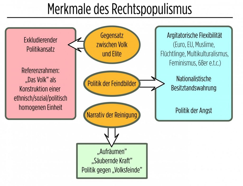 Die Realität sei aber eine andere. Es sei der neuen Rechten gelungen, alte Ideologien neu aufzubereiten und damit auch Arbeitnehmer wieder zu erreichen. Fremdenhass, oft Antisemitismus und neuerdings Islamfeindlichkeit sind die treibenden Kräfte. Die Bürger werden als Opfer dargestellt, die jeweiligen extrem rechten Parteien als ihre alleinigen Vertreter bzw. Retter. Sie würden sich nach außen gegen Eliten stellen; paradoxerweise würden ihre Politiker aber selbst zu diesen gehören (Millionäre, Professoren …). Die Ablehnung von Pluralitäten sei diesen Parteien gemein; sie reduzieren alle Probleme und Lösungen auf einen Nenner (heute das Volk, morgen die Rasse …), bewegten sich nahe am Nationalsozialismus. Das Volk brauche in dieser Ideologie keine Demokratie, lediglich sie als Fürsprecher …