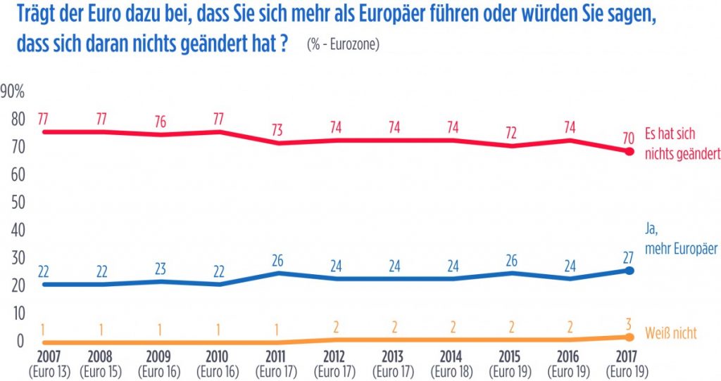 In den kommenden Jahren könnte die Zufriedenheit mit der gemeinsamen Währung noch steigen, denn es sind vor allem junge Menschen, die den Durchschnittswert nach oben treiben. Eine noch höhere Zustimmung erhält die Frage, ob der Euro eine gute Sache für die EU insgesamt sei. In der Eurozone stimmten 74 Prozent der Befragten dem zu, 16 Prozent meinten, es sei schlecht für die Union, jeweils fünf Prozent konnten sich nicht entscheiden oder wussten keine Antwort zu geben.